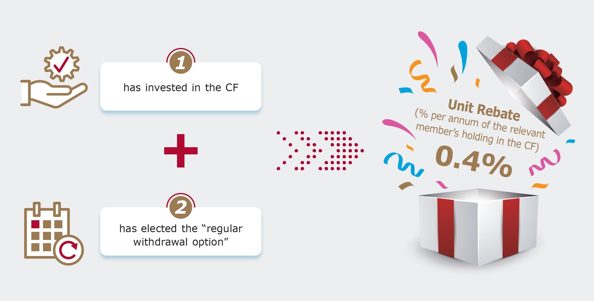 7 The unit rebate will be calculated and paid monthly from the Management fees, and will be credited into the members' account in the form of allotment of new units of the CF. Such allotment will be made after the number of units to be rebated is ascertained at the end of the relevant period. The Investment Manager reserves the right to change the applicable rate of the rebate by giving members not less than one month's notice (or such other notice period as required by the MPFA and the SFC). Please refer to section 5.4 "Unit rebate for investment in the BOC-Prudential Hong Kong Stable Retirement Fund upon reaching retirement stage" and section 6.11 "Regular withdrawal option upon reaching retirement stage" of the MPF Scheme Brochure of the Scheme for details. If no regular withdrawal option is elected by the Eligible Retired Member or no investment is made in the CF, no unit rebate will be paid to the member under section 5.4 of the MPF Scheme Brochure of the Scheme.